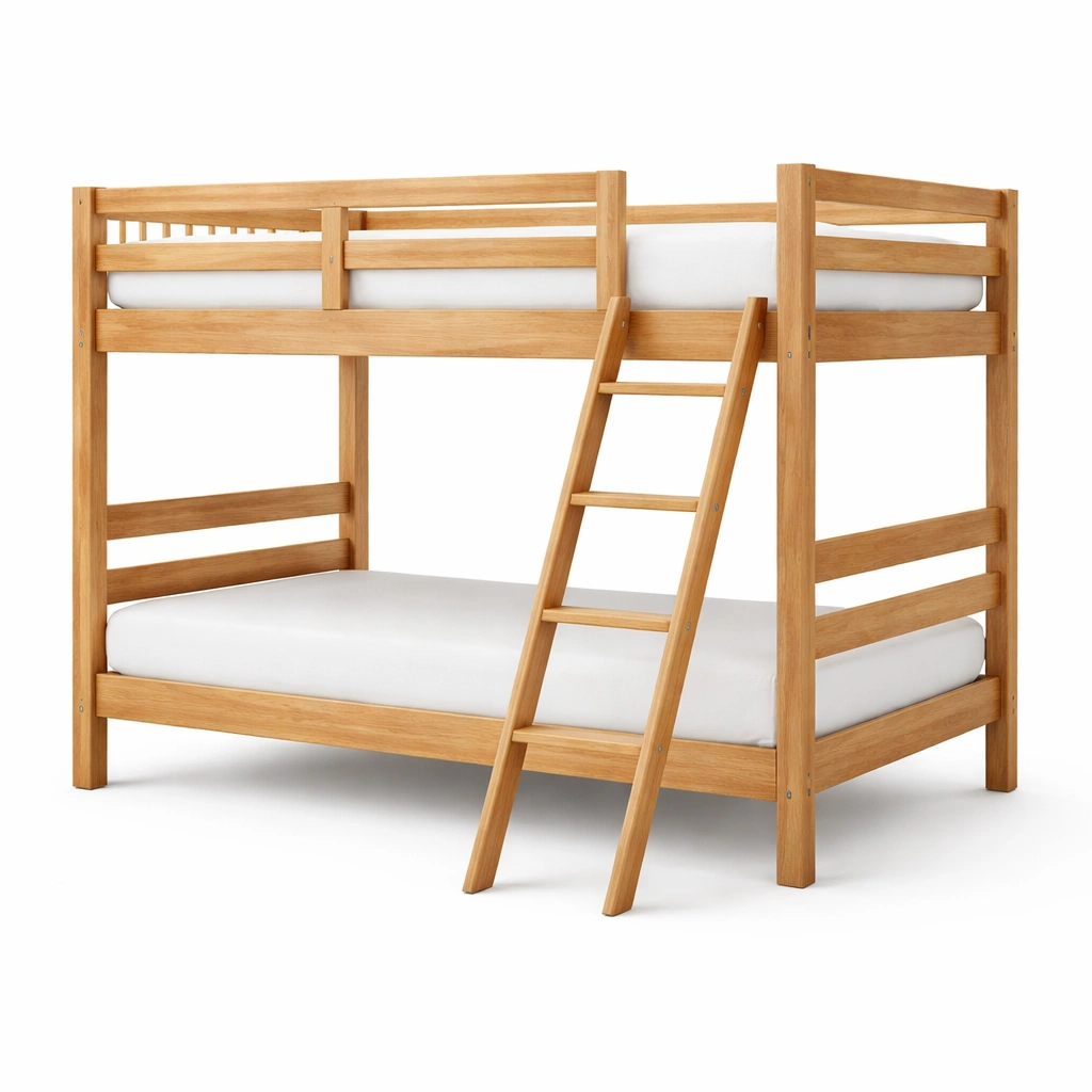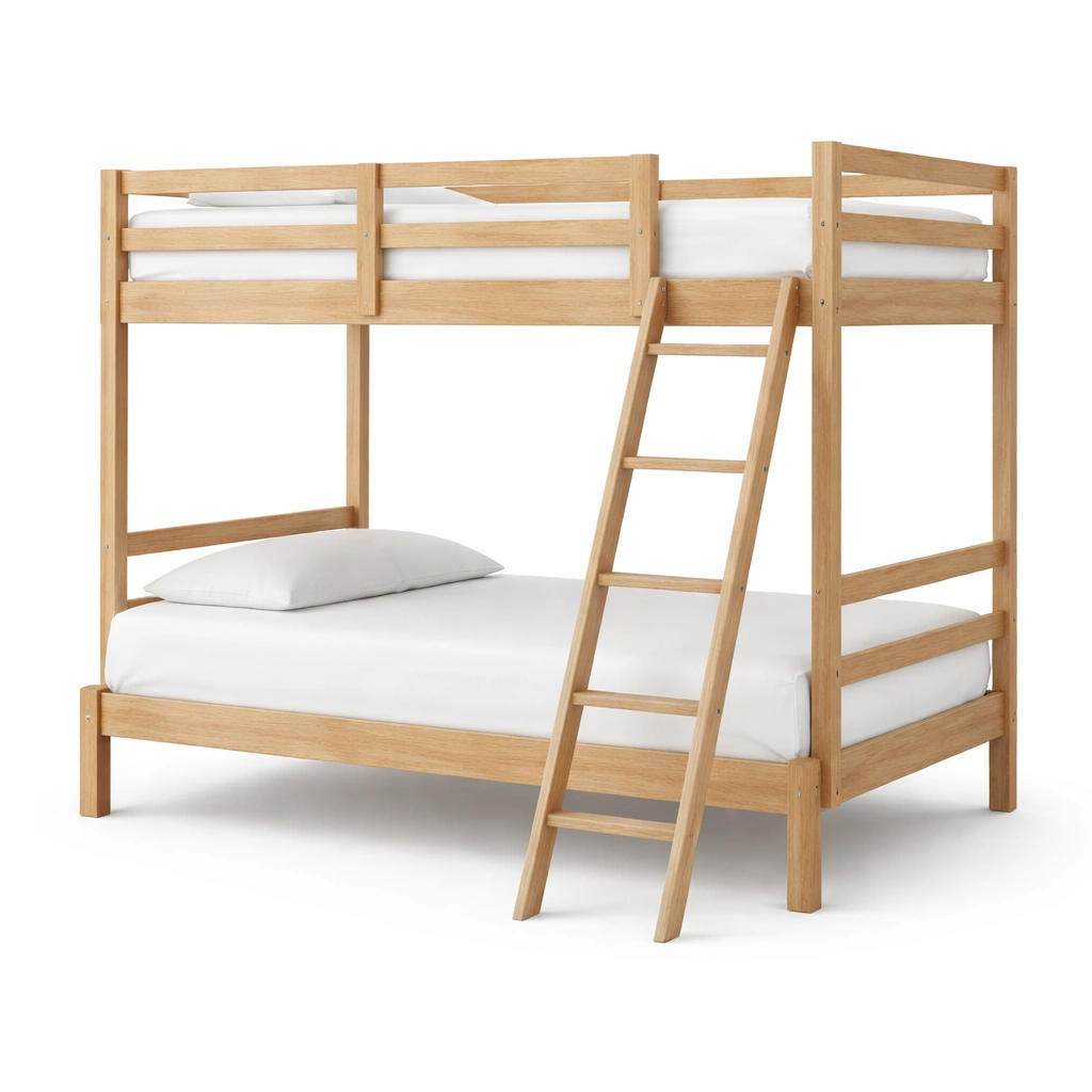 Litera de madera maciza natural con escalera y colchones blancos