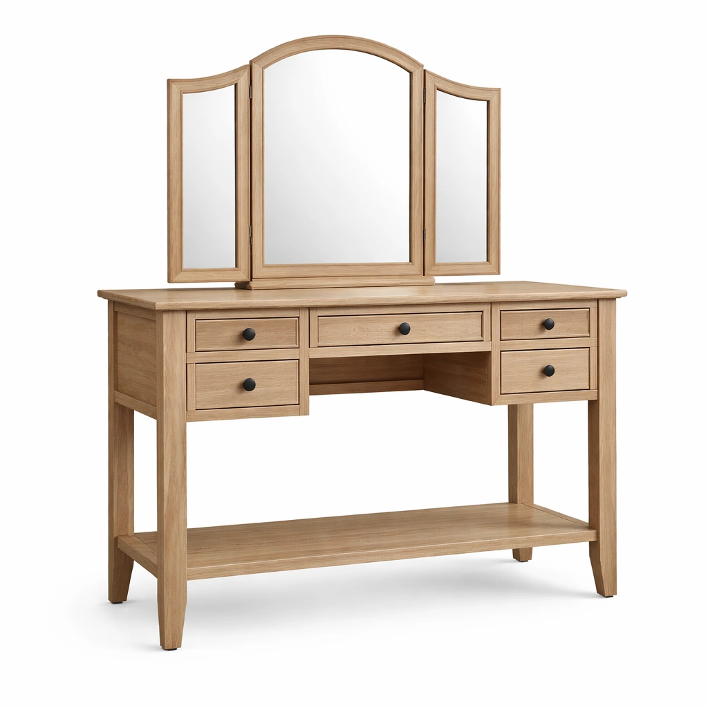 Tocador de madera con espejo tríptico y cinco cajones
