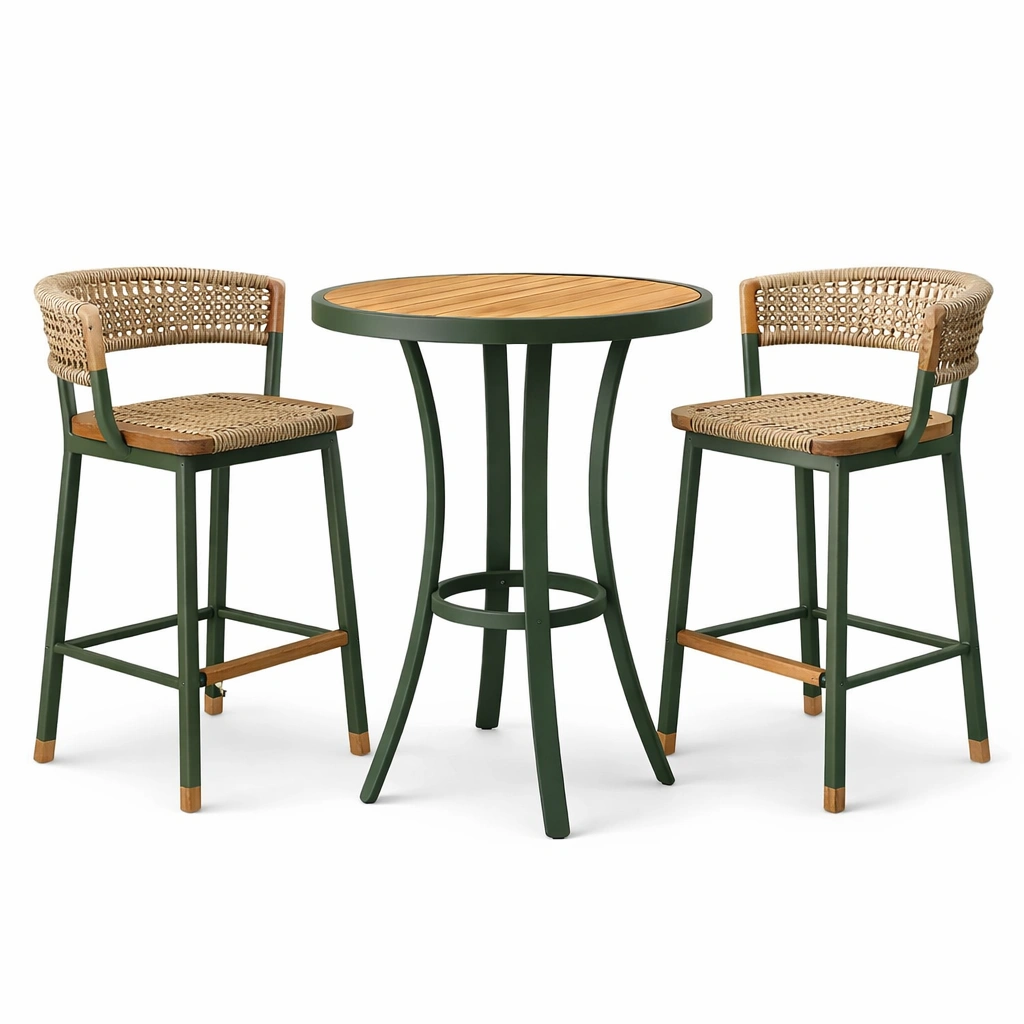 - Sillas: estructura de aluminio, asiento y respaldo de ratán sintético, detalles en teca