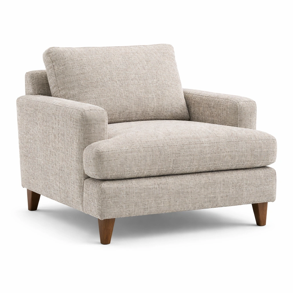 Este sillón cuenta con una estructura de madera maciza y está tapizado en tela de poliéster beige. El relleno es de espuma de alta densidad. No requiere montaje y es fácil de limpiar con un paño húmedo. Peso máximo soportado: 120 kg.